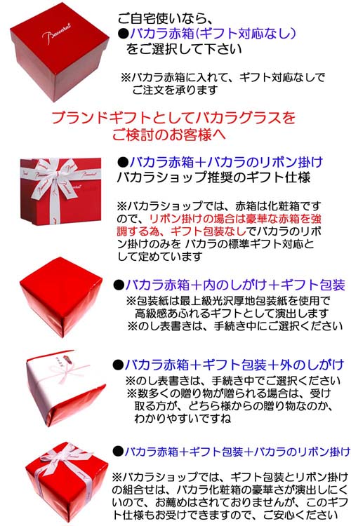 グラスは、上記の専用ギフト赤箱にいれお届け致します。 ギフト包装やのしがけご希望の方は、お申込み手続きで、お受け致します。