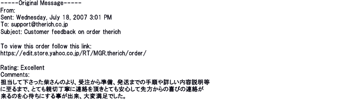 2009年3月17日いつも、ご丁寧な対応、そして梱包、配送に、御社の顧客に対しての心のこもった対応がとても