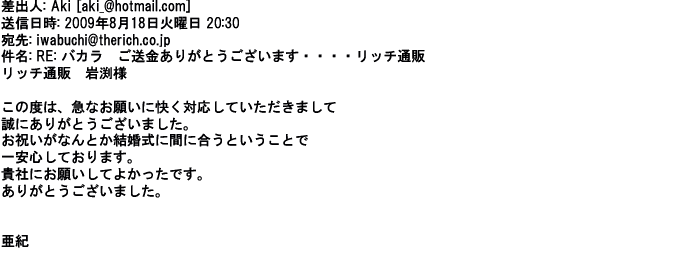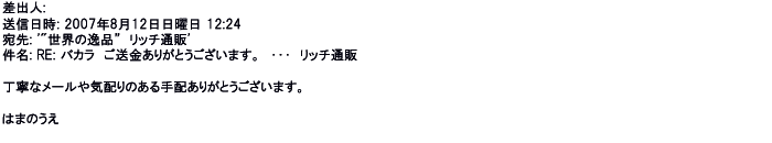 2007年8月12日丁寧なメールや気配りのある手配ありがとう