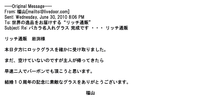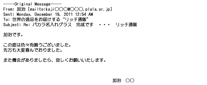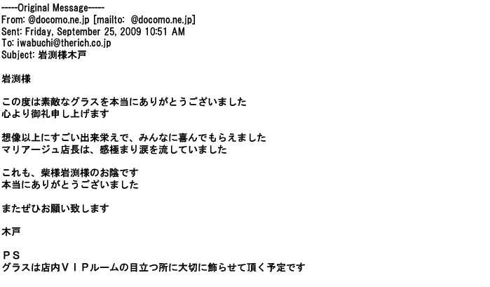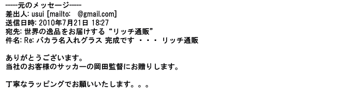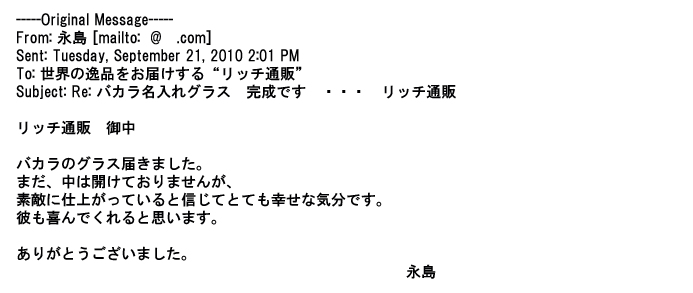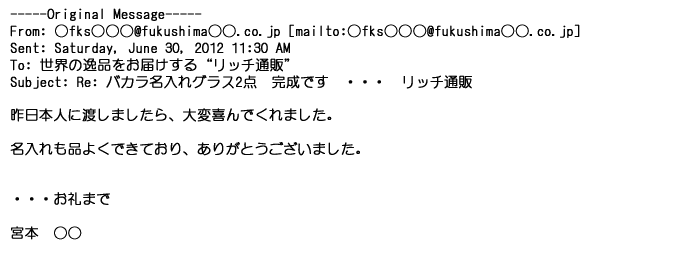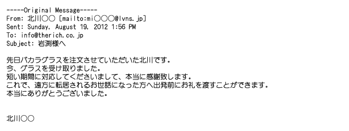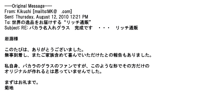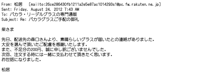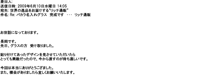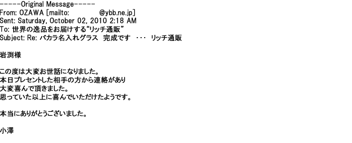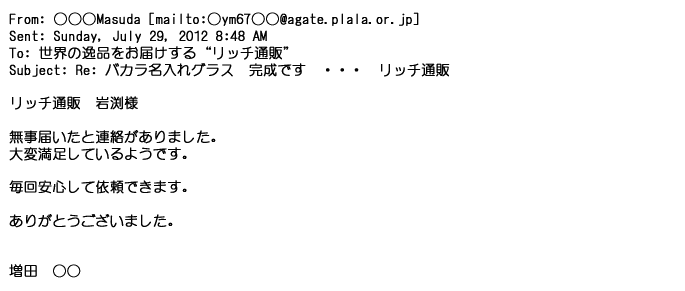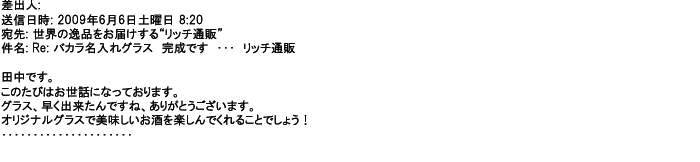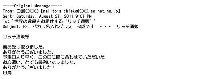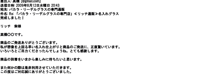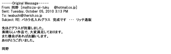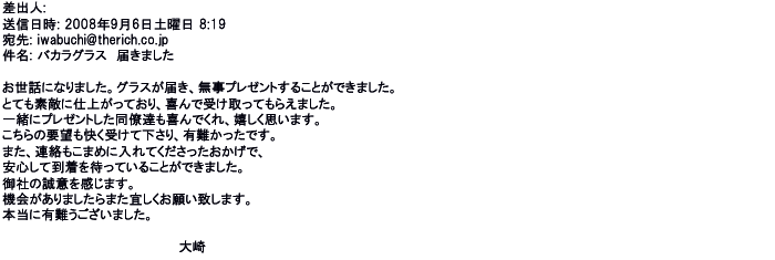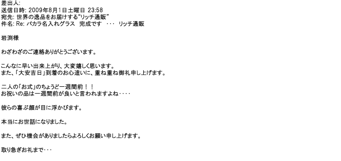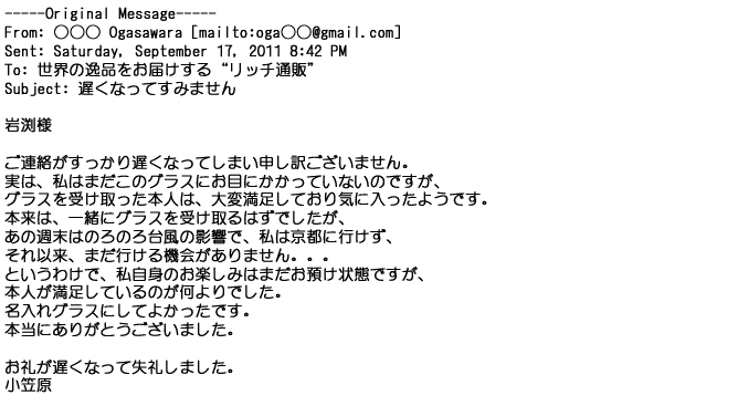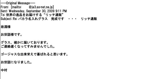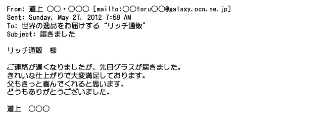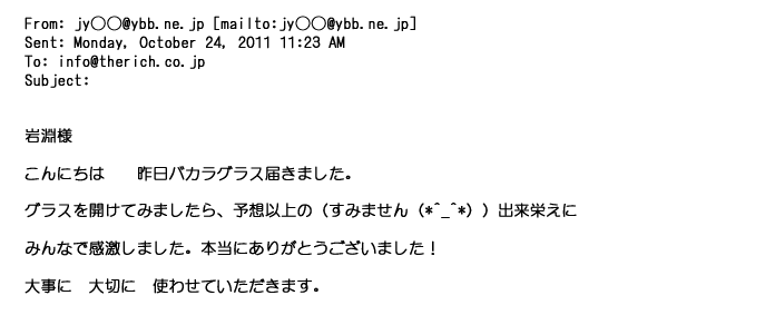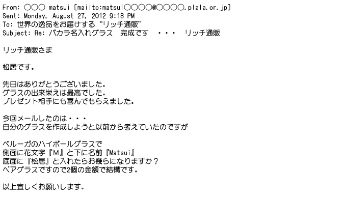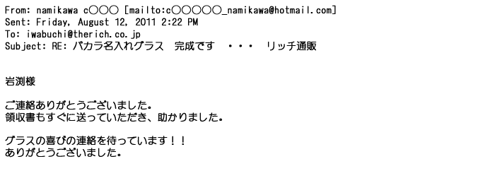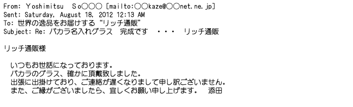 2012年8月27日グラスの出来栄えは最高でした。今回メールしたのは・・・
