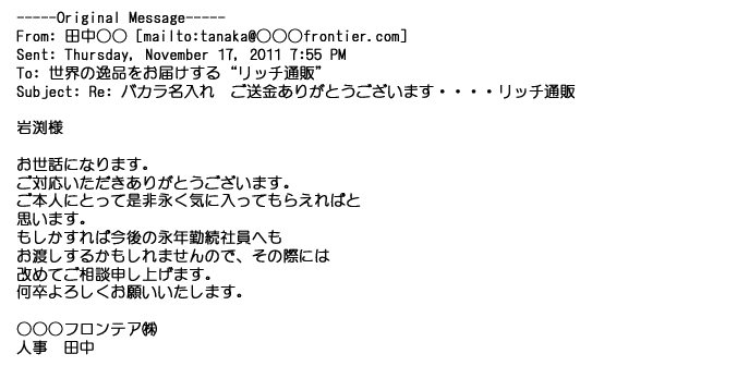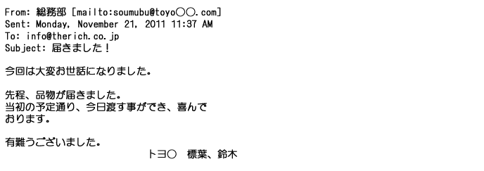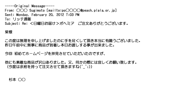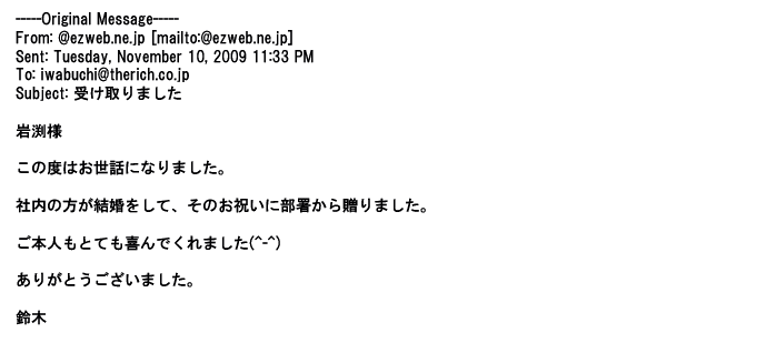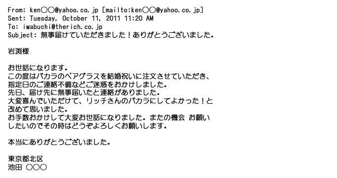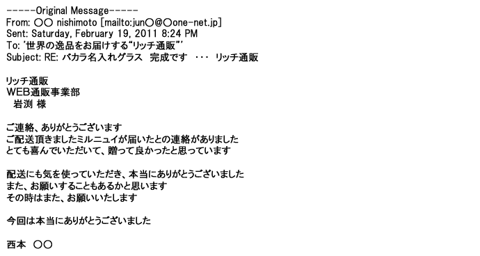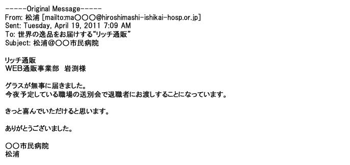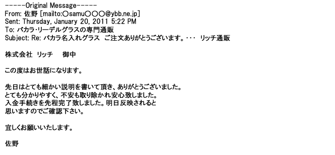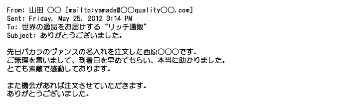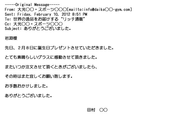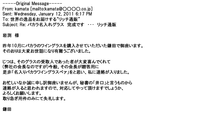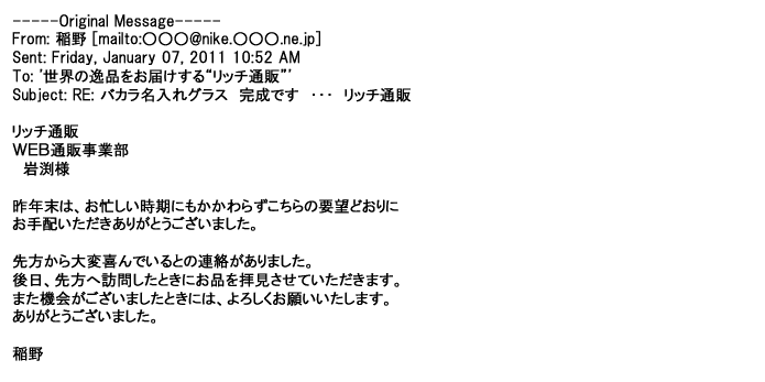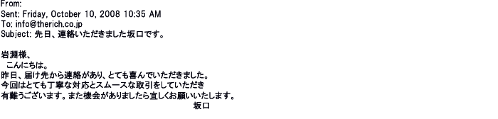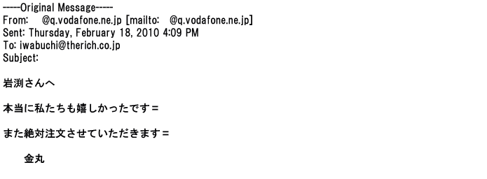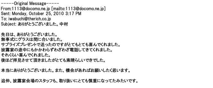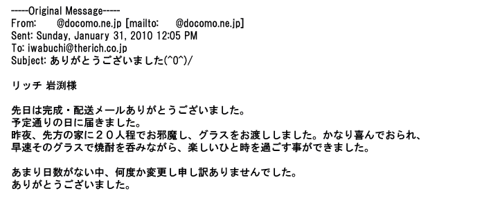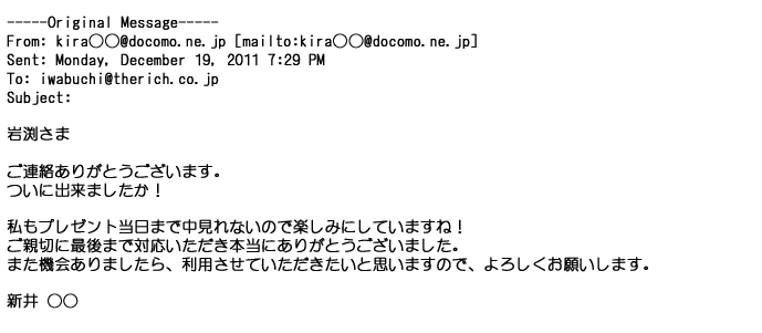 2012年1月31日先生からお礼を言われ、恐らく満足していただけたのかなと思い、お礼のメールをさせてもらいました。