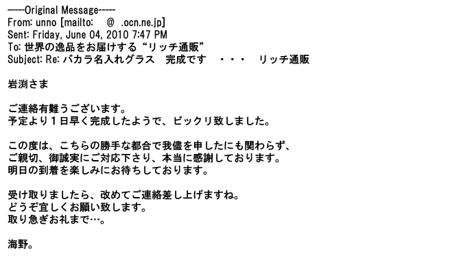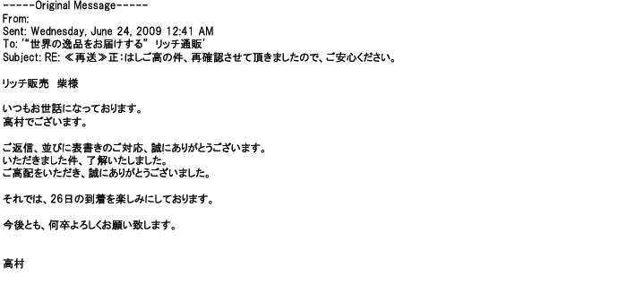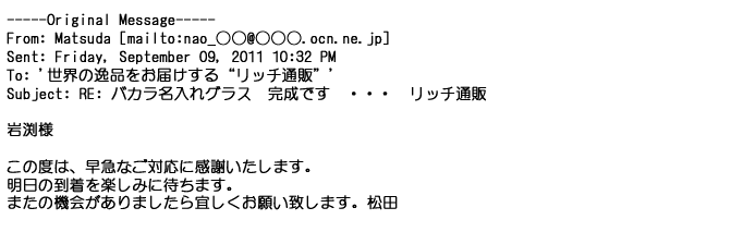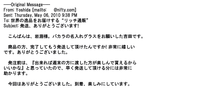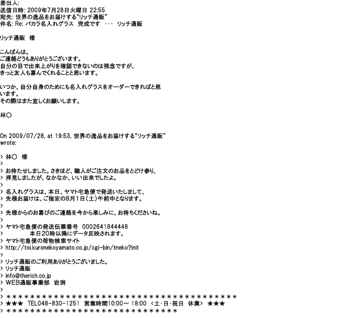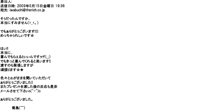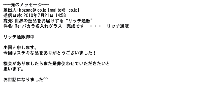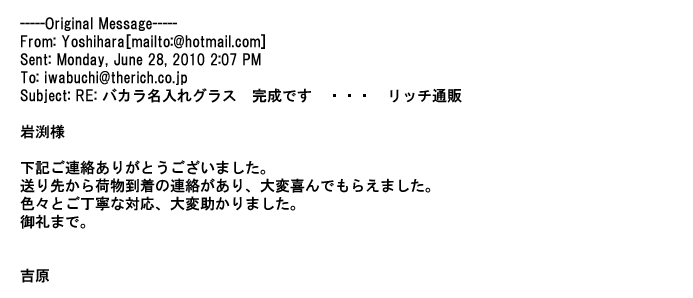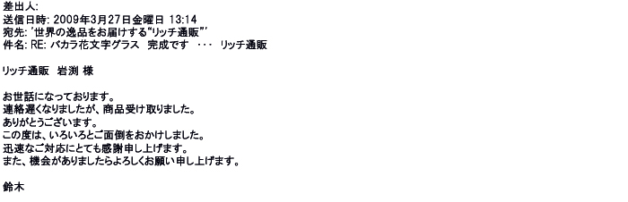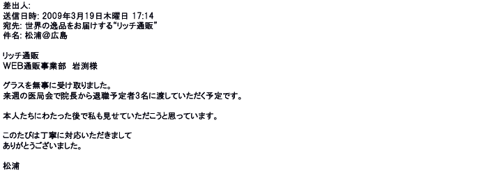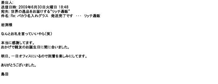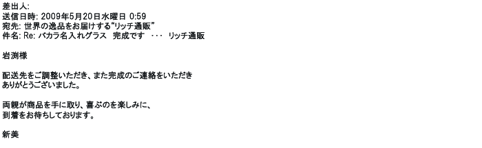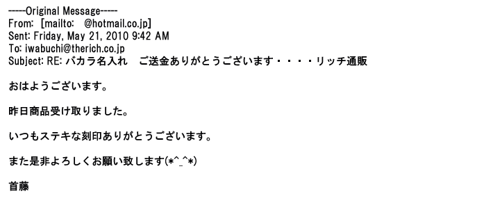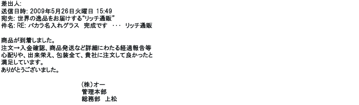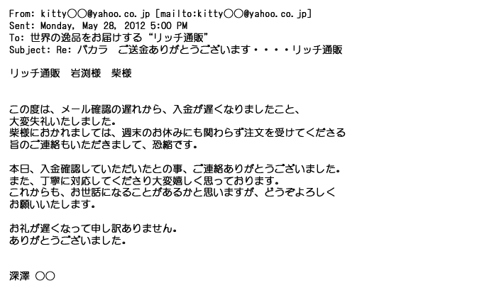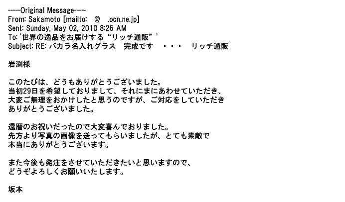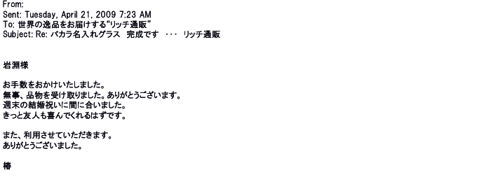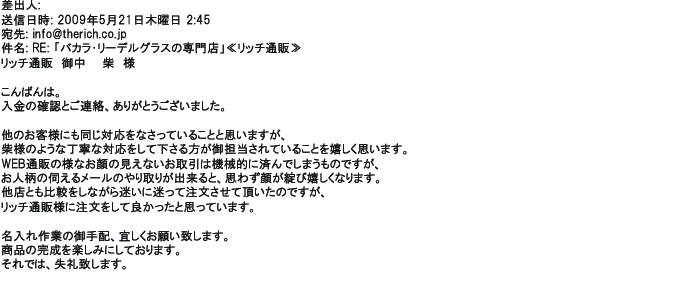 2009年5月21日お顔の見えないお取引は機械的に済んでしまうものですが、お人柄の伺えるメールのやり取りが出来ると思わず