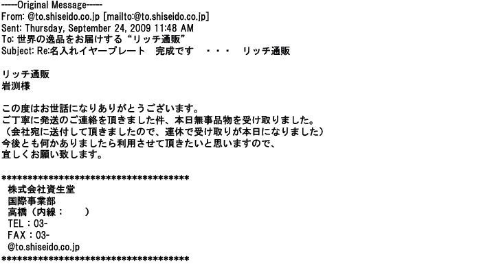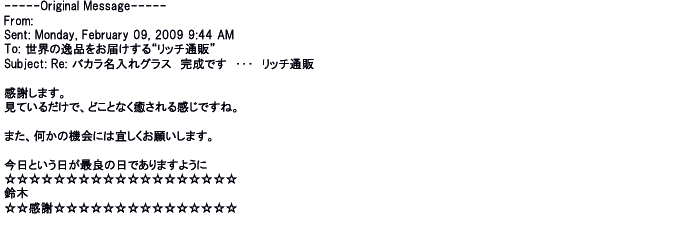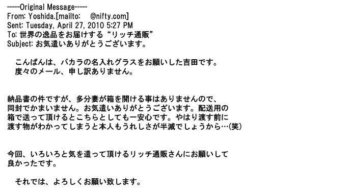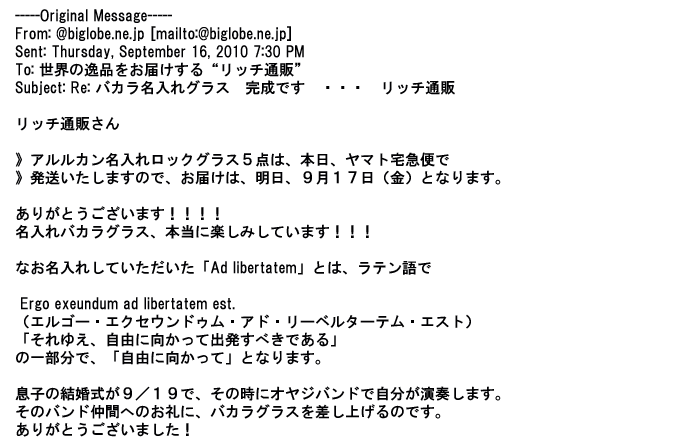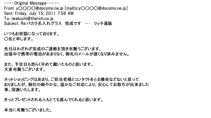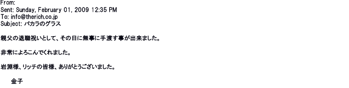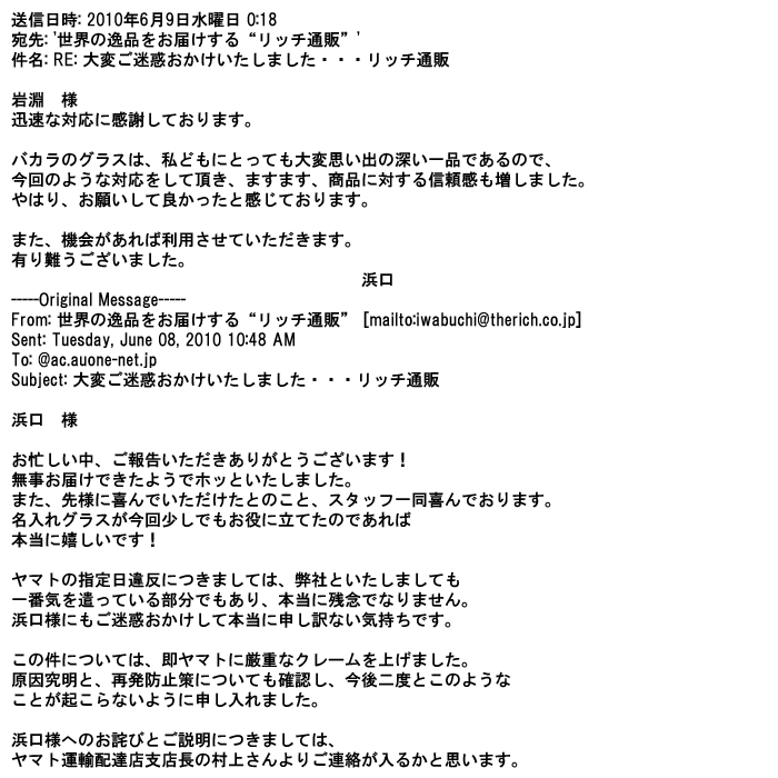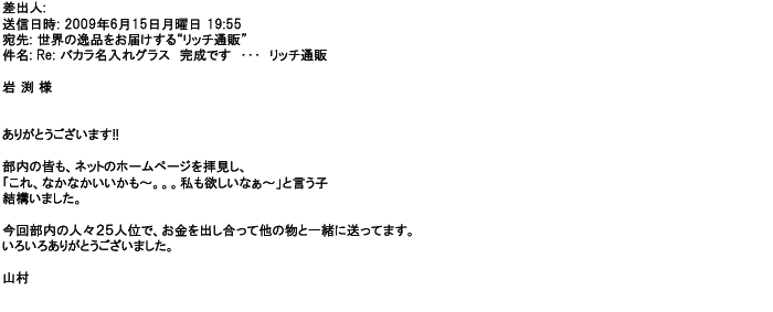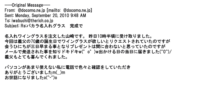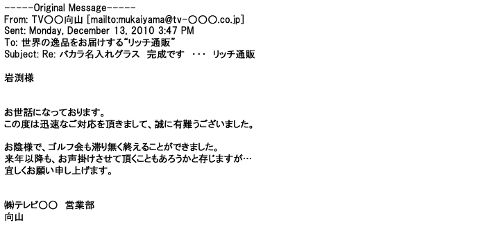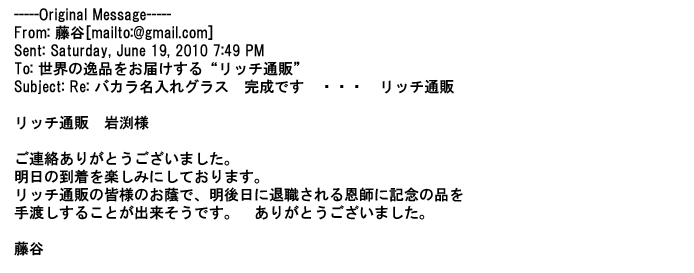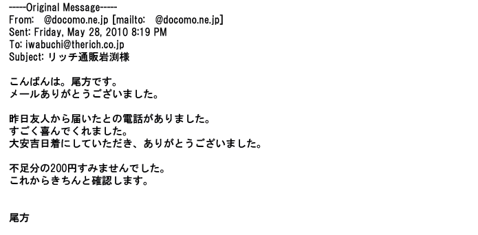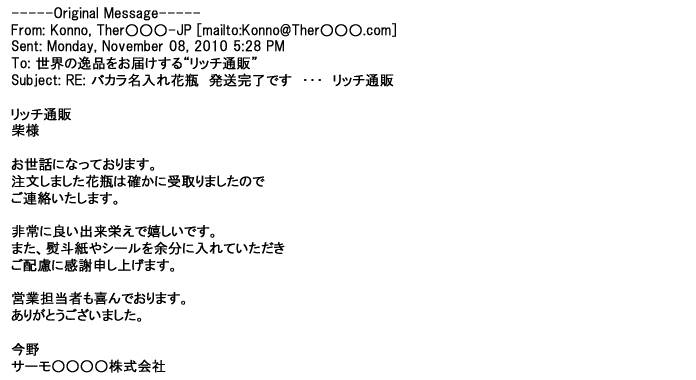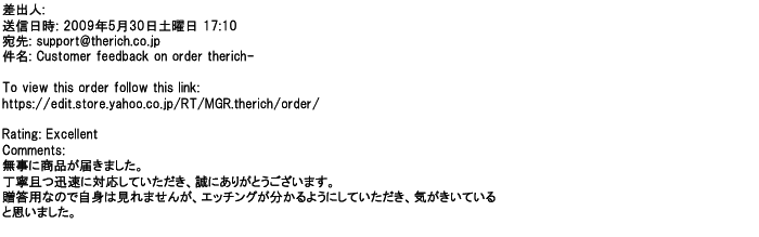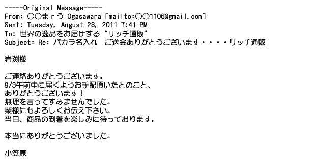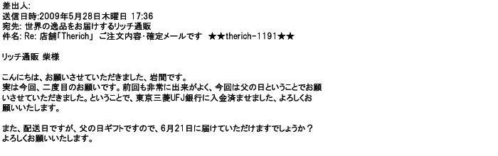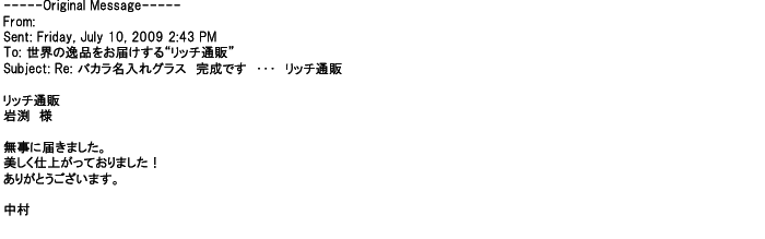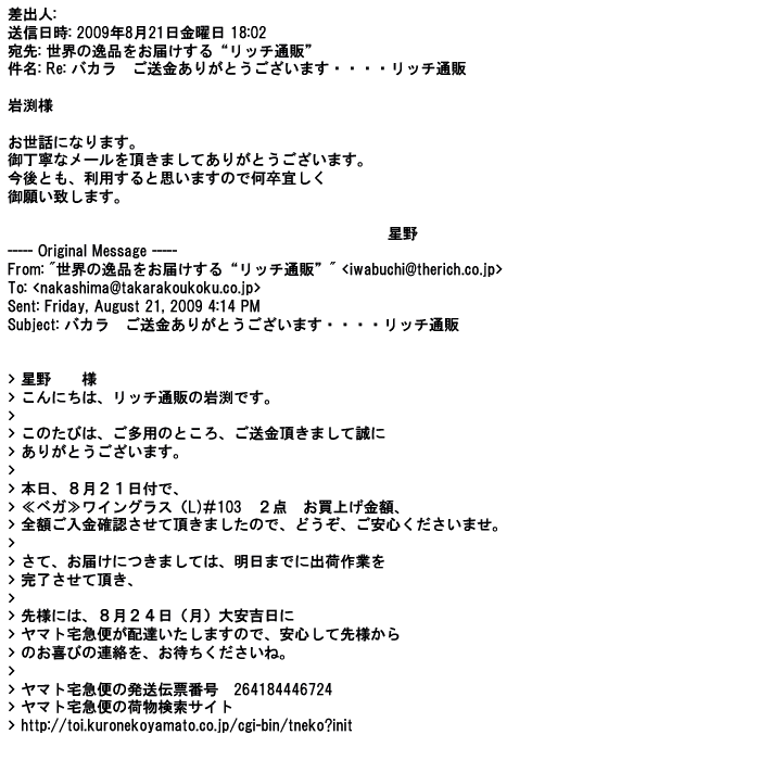 2009年5月21日お顔の見えないお取引は機械的に済んでしまうものですが、お人柄の伺えるメールのやり取りが出来ると思わず