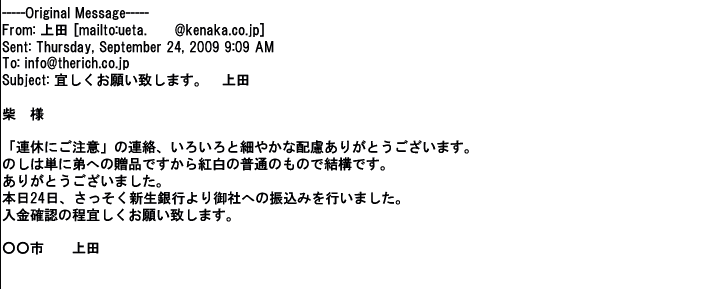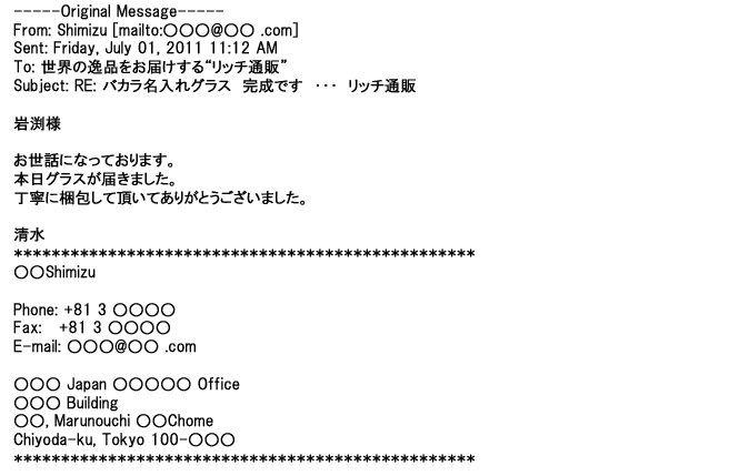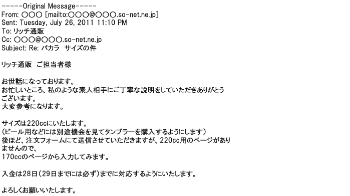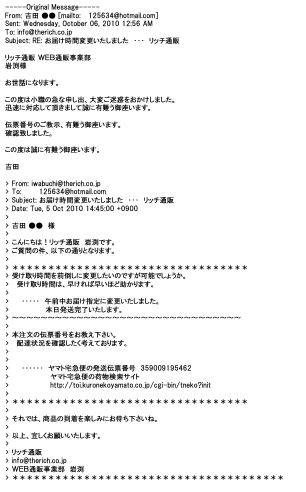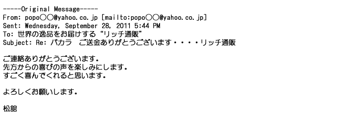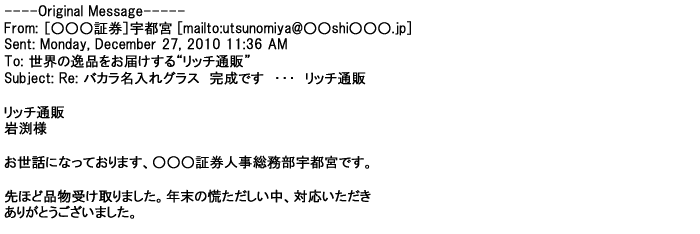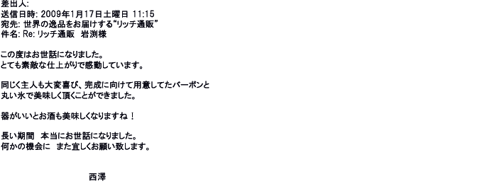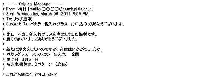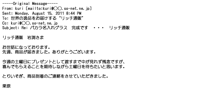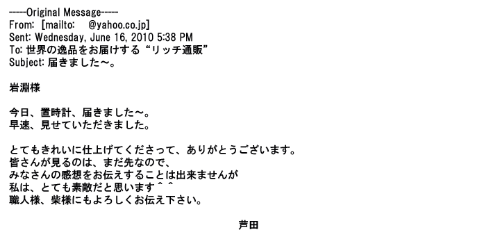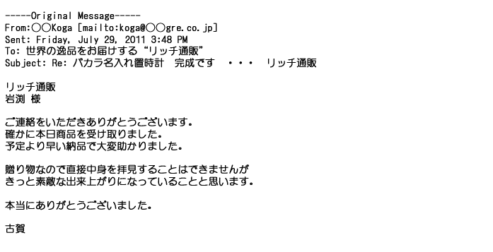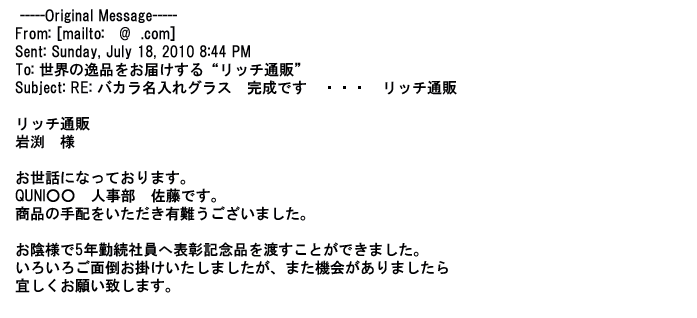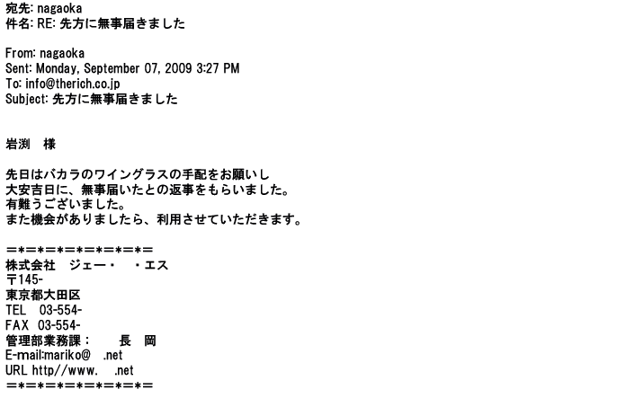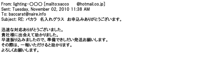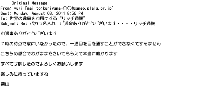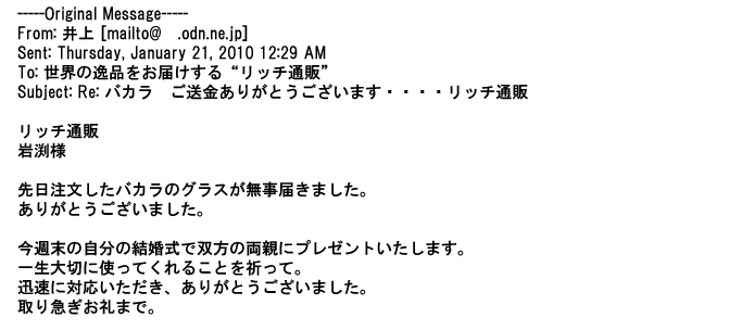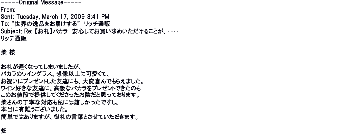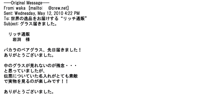 2009年5月21日お顔の見えないお取引は機械的に済んでしまうものですが、お人柄の伺えるメールのやり取りが出来ると思わず
