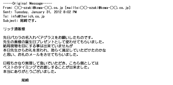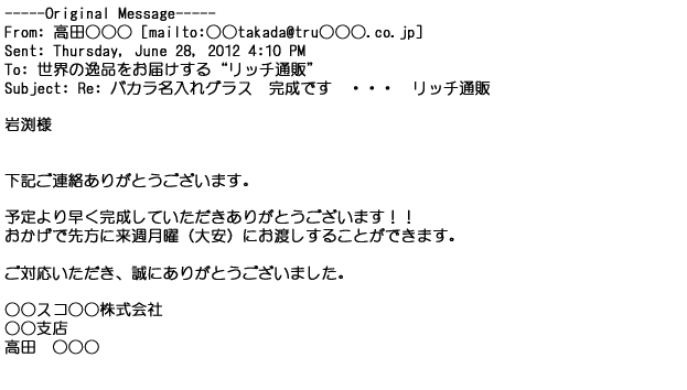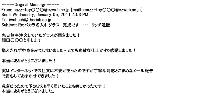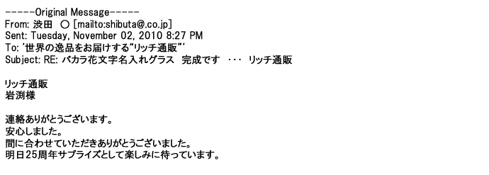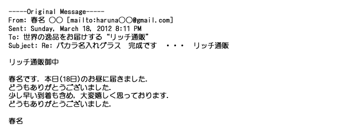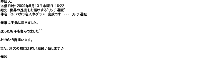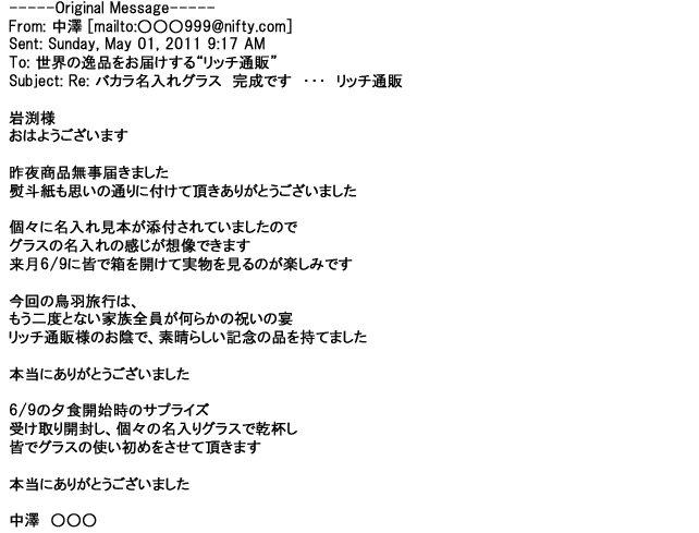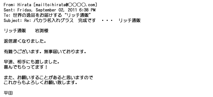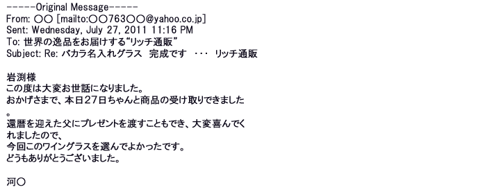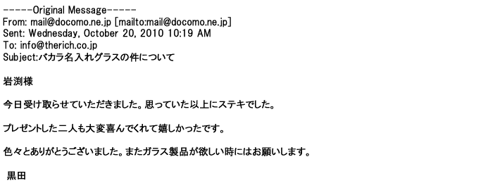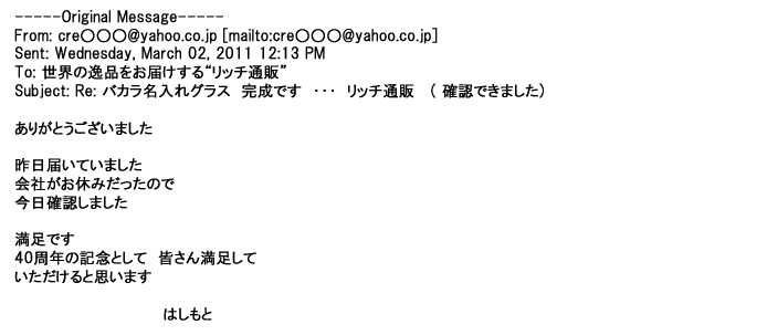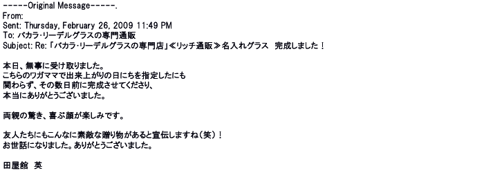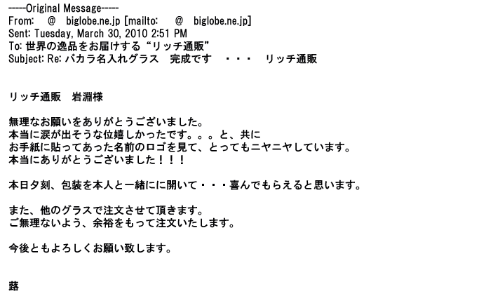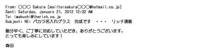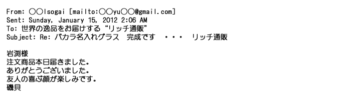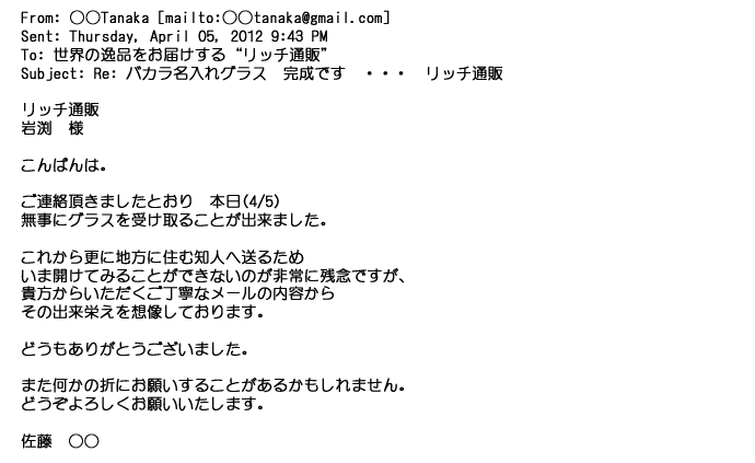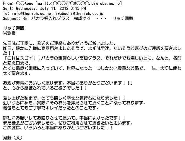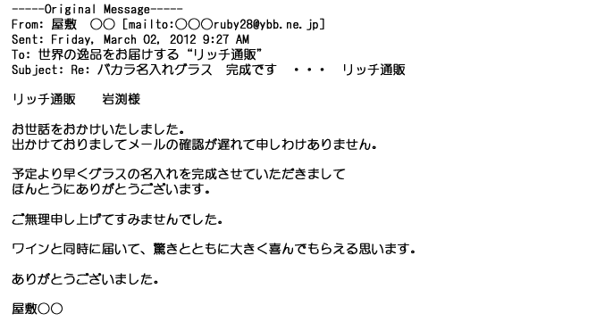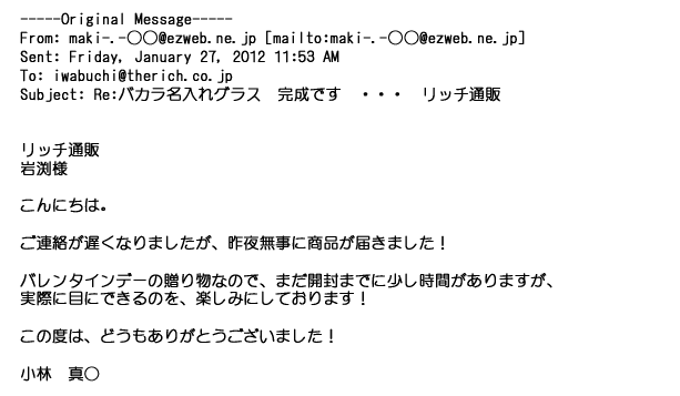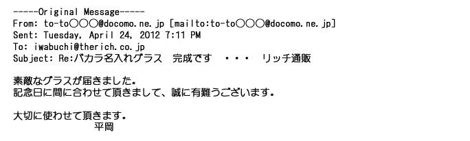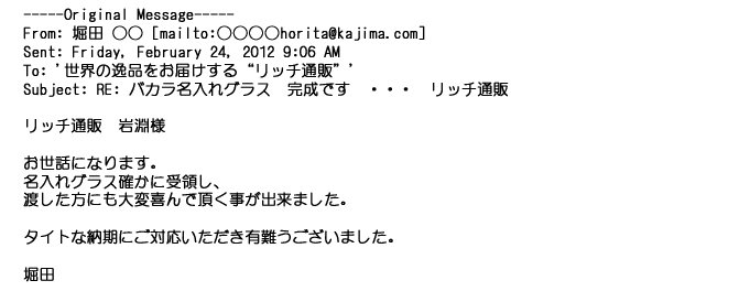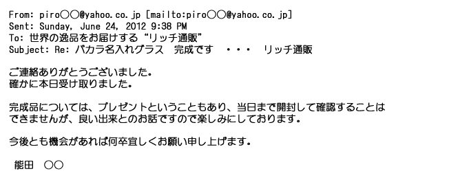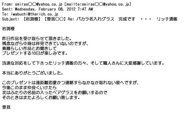 2012年2月24日名入れグラス確かに受領し、渡した方にも大変喜んで頂く事が出来ました。タイトな納期にご対応いただき