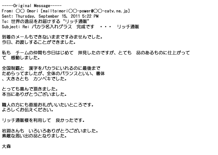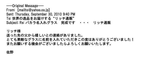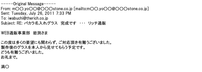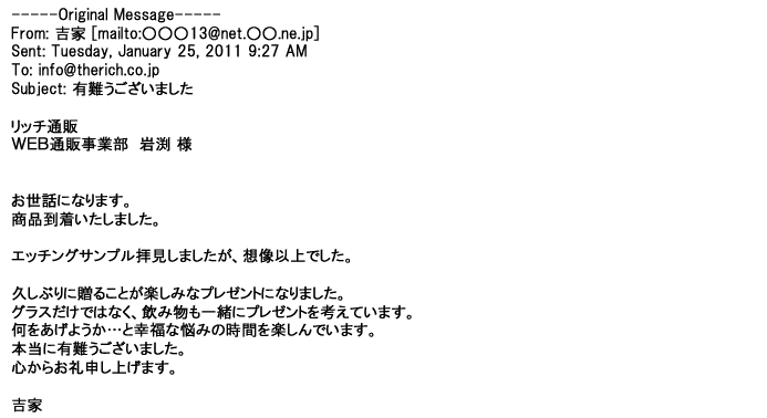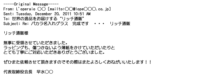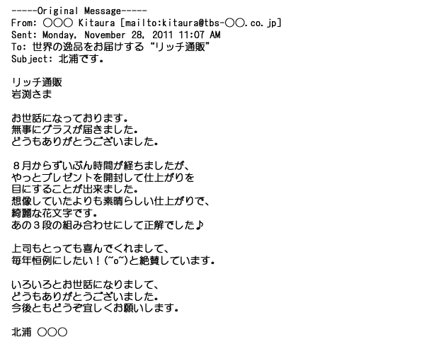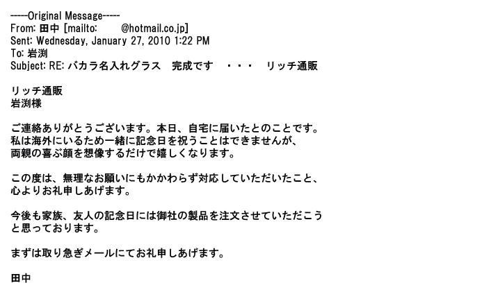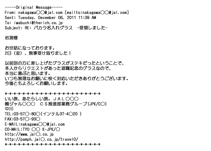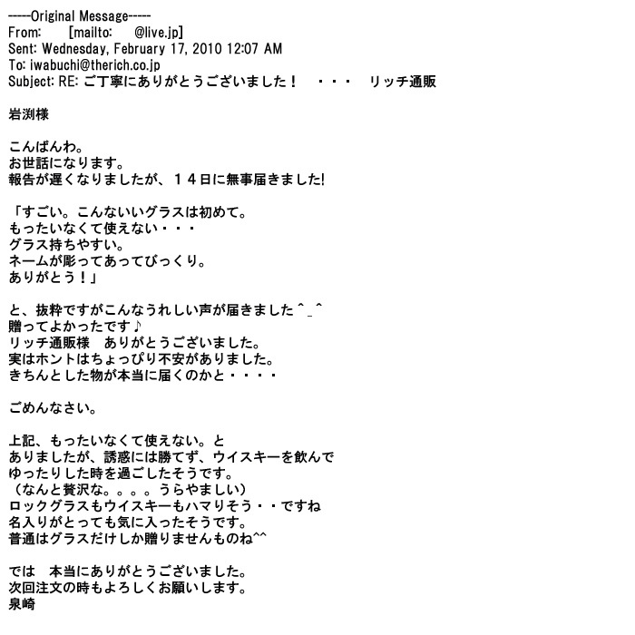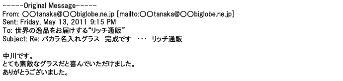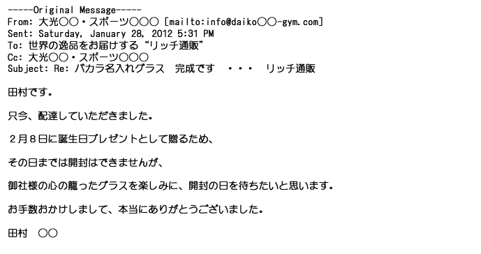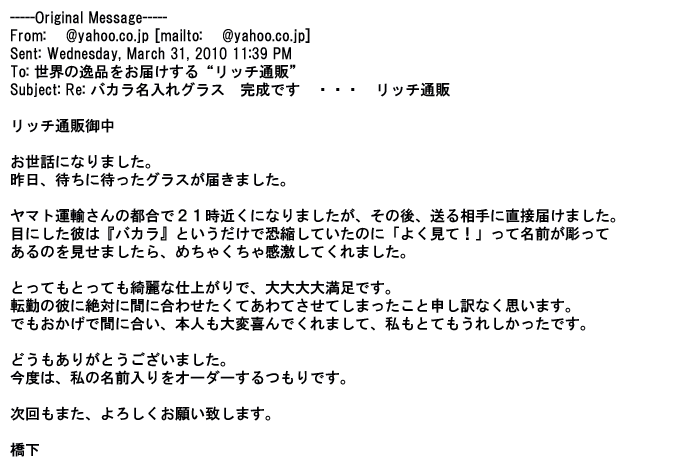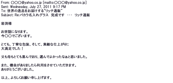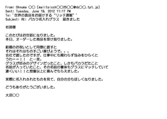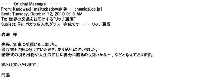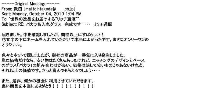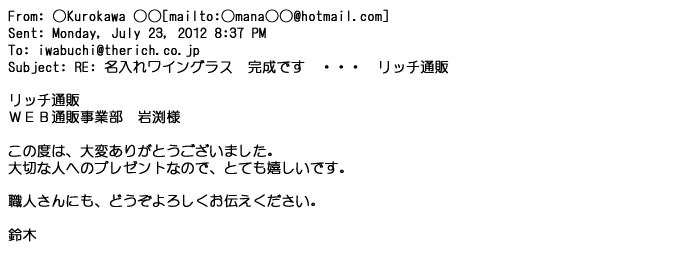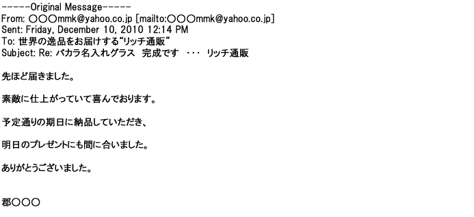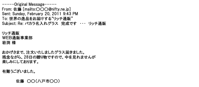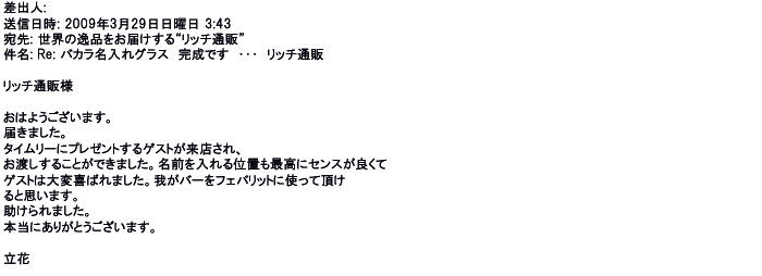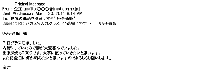 2012年2月24日名入れグラス確かに受領し、渡した方にも大変喜んで頂く事が出来ました。タイトな納期にご対応いただき