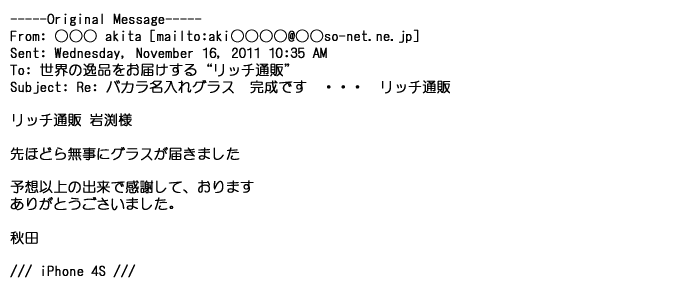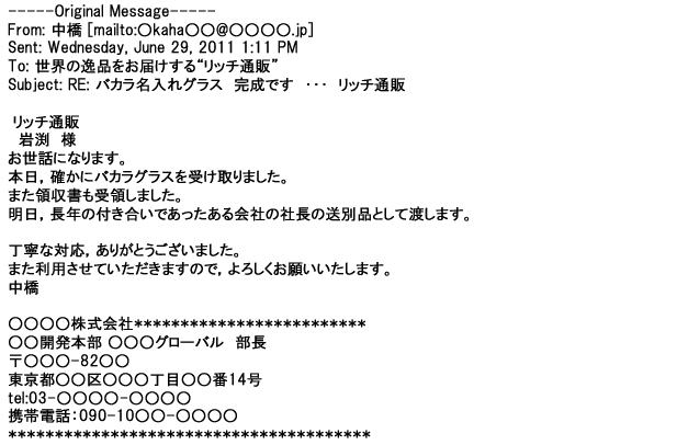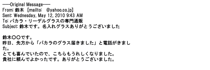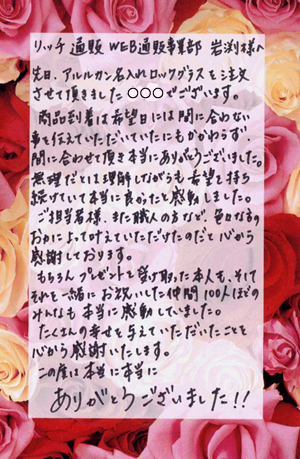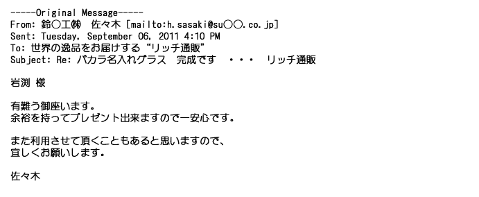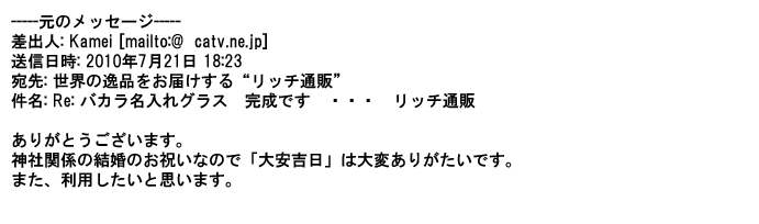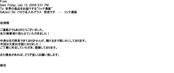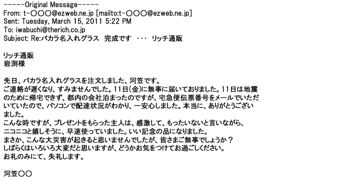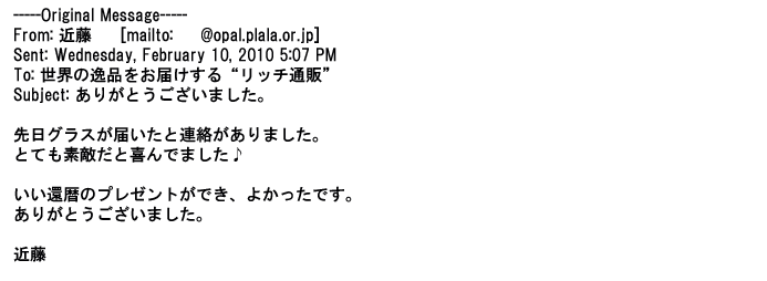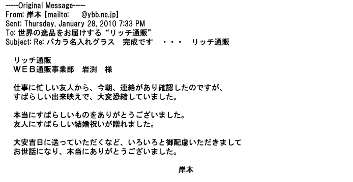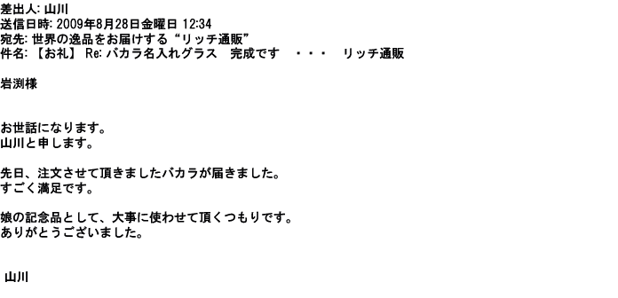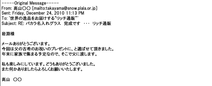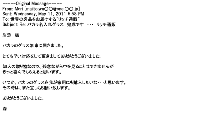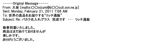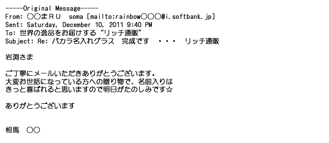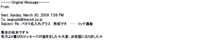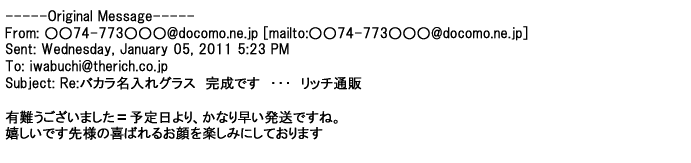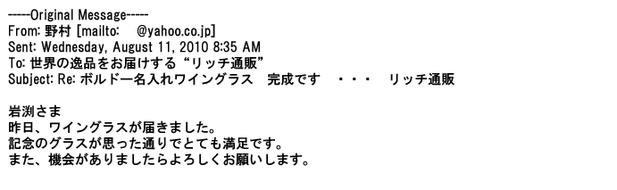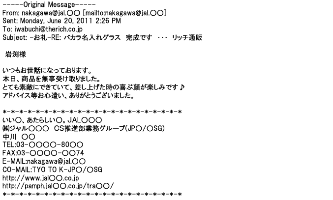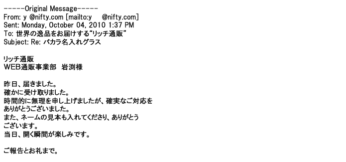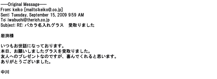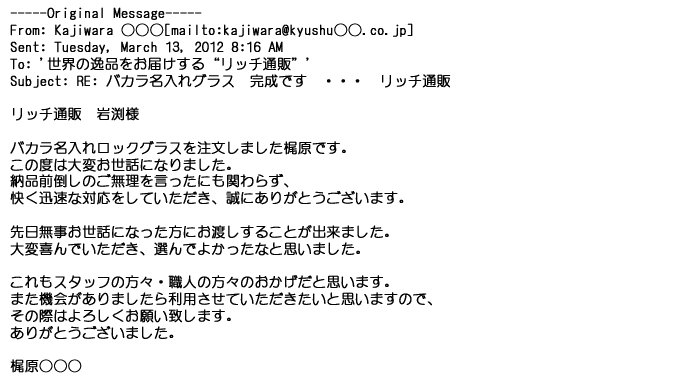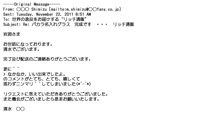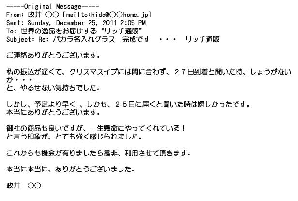 2012年2月24日名入れグラス確かに受領し、渡した方にも大変喜んで頂く事が出来ました。タイトな納期にご対応いただき
