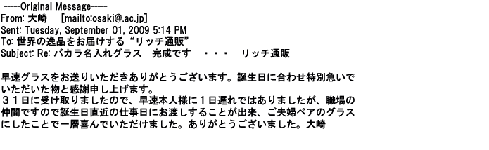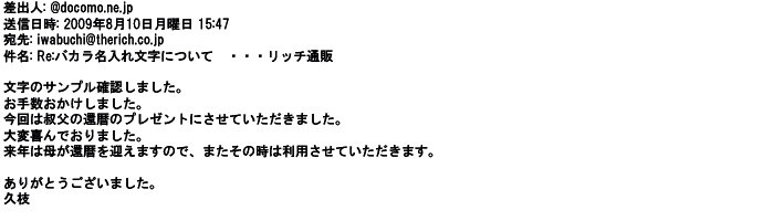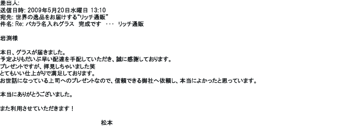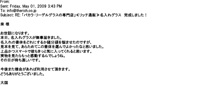 2009年5月20日お世話になっている上司へのプレゼントなので、信頼できる御社へ依頼し、本当によかったと思っています。