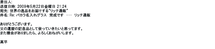 2012年5月27日先日グラスが届きました。きれいな仕上がりで大変満足しております。父もきっと喜んでくれると思います。