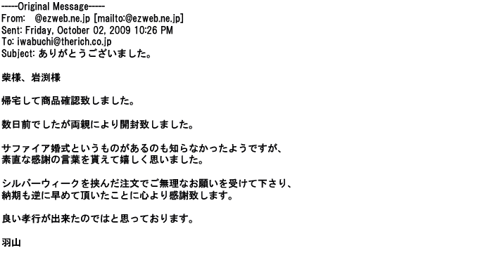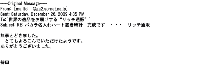 2009年5月26日注文→入金確認や詳細にわたる経過報告等心配りや、出来栄え、包装全て、貴社に注文して良かった