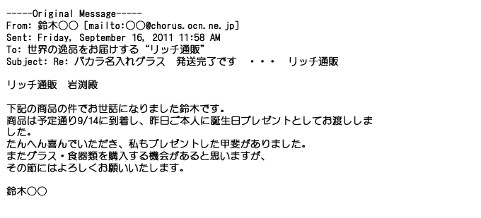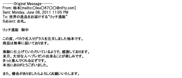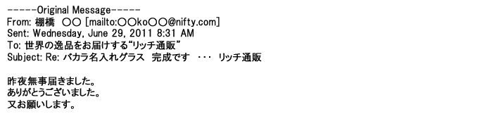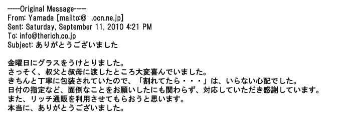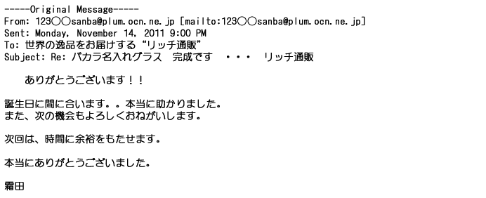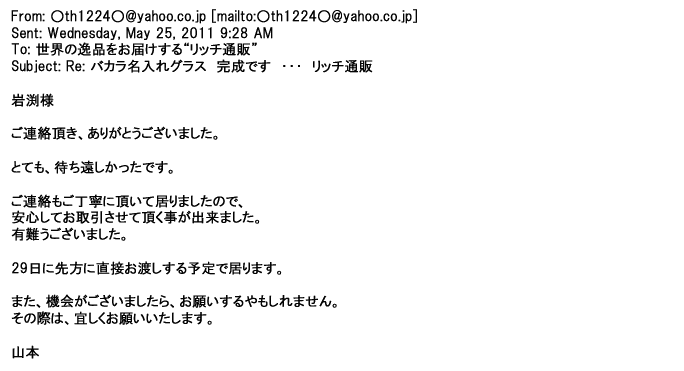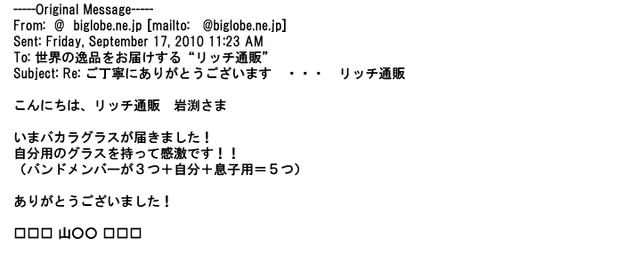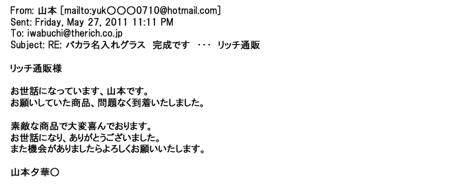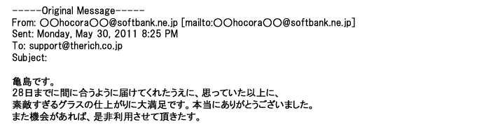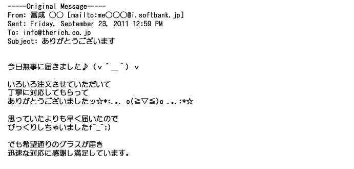 2011年9月23日丁寧に対応してもらって、希望通りのグラスが届き・・・・本当にありがとうございましたっ♪