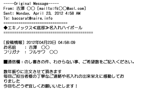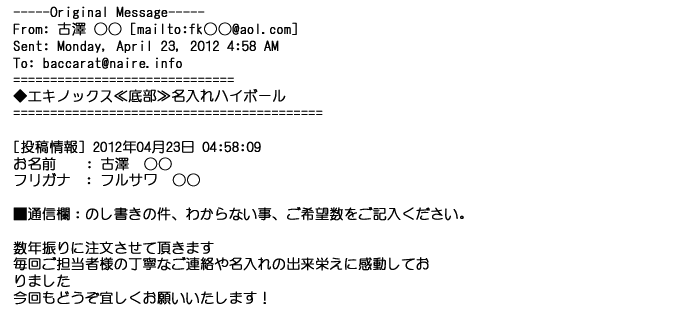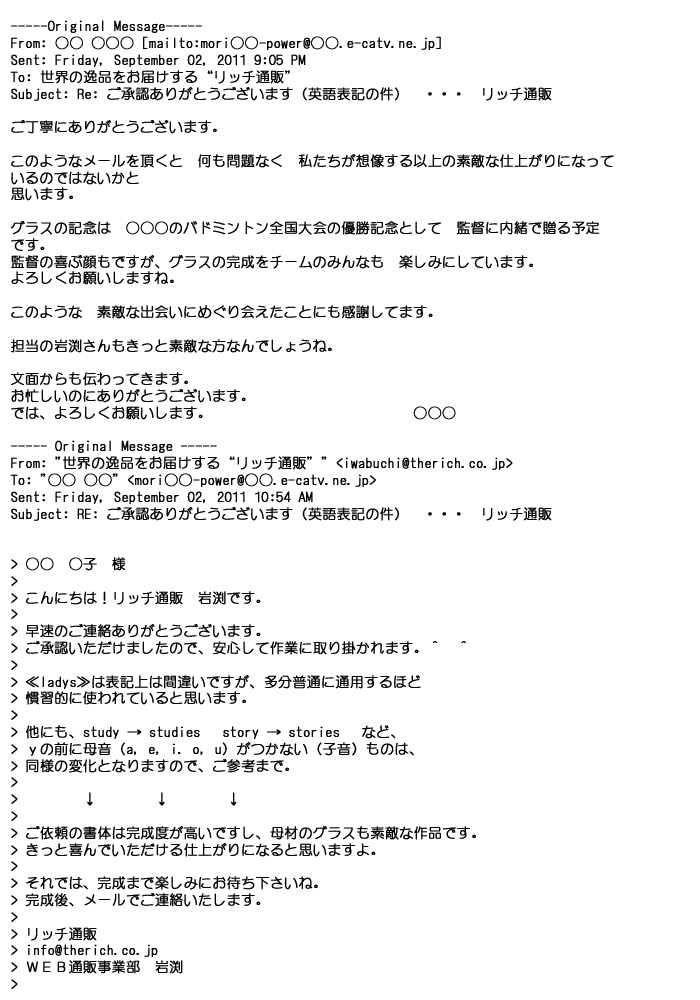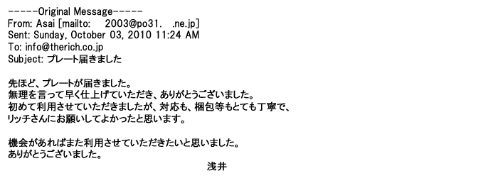 2012年4月14日数年振りに注文させて頂きます。毎回ご担当者様の丁寧なご連絡や名入れの出来栄えに感動しておりました。