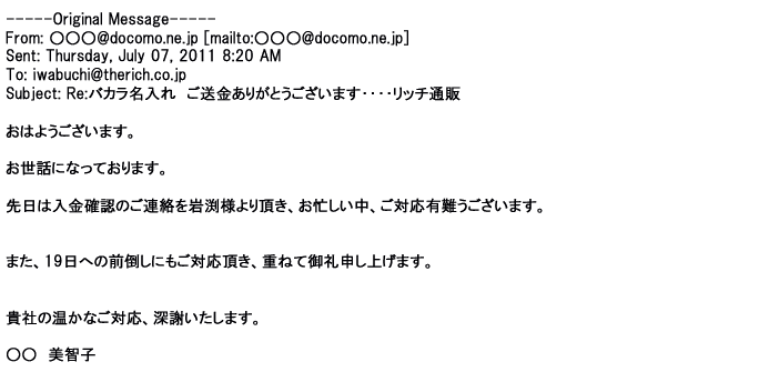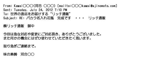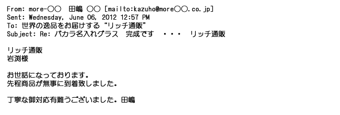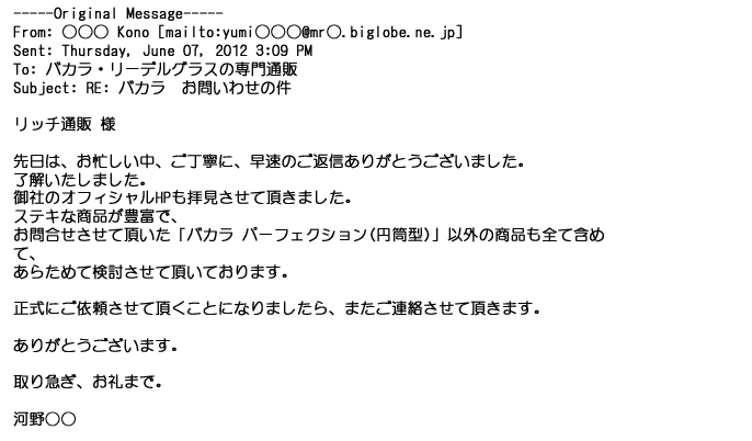 2012年6月7日お忙しい中、ご丁寧に、早速のご返信ありがとうございました。御社のオフィシャルHPも拝見させて頂きました。