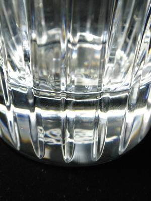 | グラスを横から見ると側面のカット模様が、口元から底部に向って、深く刻まれているのがわかります。この溝に光があたると光の反射で、光輝き、まるで光の芸術品ようです。 |