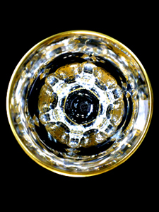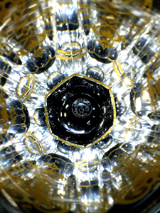 グラスを真上から、見ると・・・・グラスの側面の大胆にカットとが、グラスの奥行きをつくり、側面に施された24金の装飾とのコラボレーションが、この光の芸術を生み出しています。