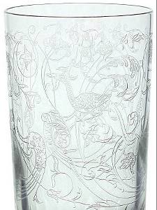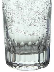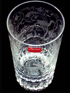 パルメとは、パリ郊外にある大統領のハンティングロッジで使われる為に1939年に作られたパターンで、楽園に住む想像上の鳥をモチーフにしたエッチングによって飾られています。グラスの底部<側面>に細かなカットが刻まれており、そのカット部分をグラスの上部から見ると、周りから入る光が、そのカット部分に反射し、光の世界に踏み込んだような錯覚を与えてくれるのが、このパルメです。