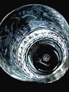 グラスの上からグラスの底を見るとこのように光かがやく万華鏡の世界に囲まれた漆黒の闇に浮かぶバカラの文字がまるでに浮き出るよう見え、クリスタルガラスの世界に君臨するバカラの地位を象徴してます。