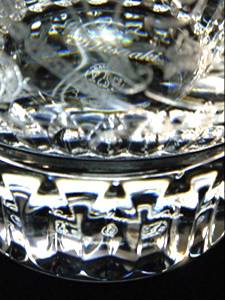 側面のエングレイビングと側面底部のカット(上の写真)が織りなす効果により、グラスの内側の底に、パールのネックレスにみえる≪光の帯≫が生まれ、パルメをより、ゴージャスな光の芸術品に仕上げています。