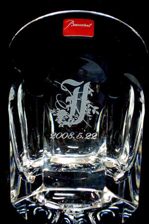 グラスの側面に花文字 J 入れ、その下に記念日を追加彫刻した特殊例