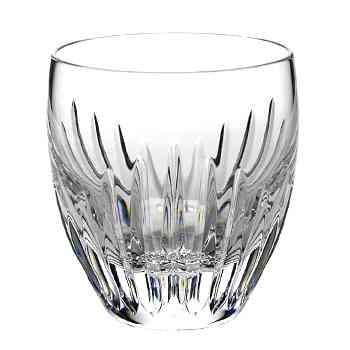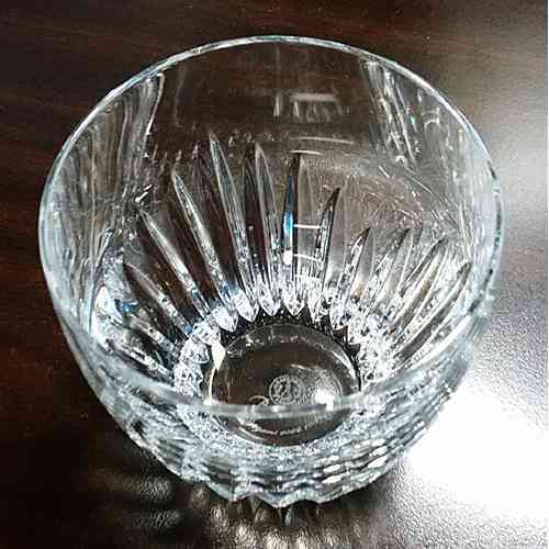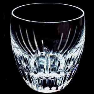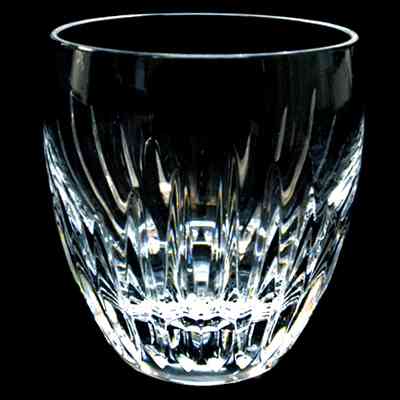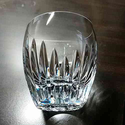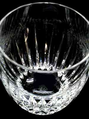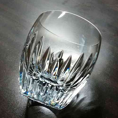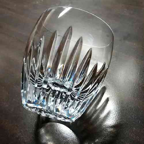 マッセナ・ロックグラスを斜め上から見て グラス側面に深く縦に刻まれたカットが光の芸術を・・・