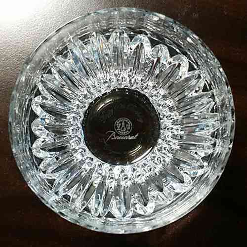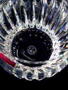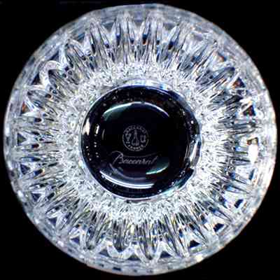 側面に刻まれた縦溝カットが底部外周に円形状に刻まれ中央部にバカラのロゴマークが見えます