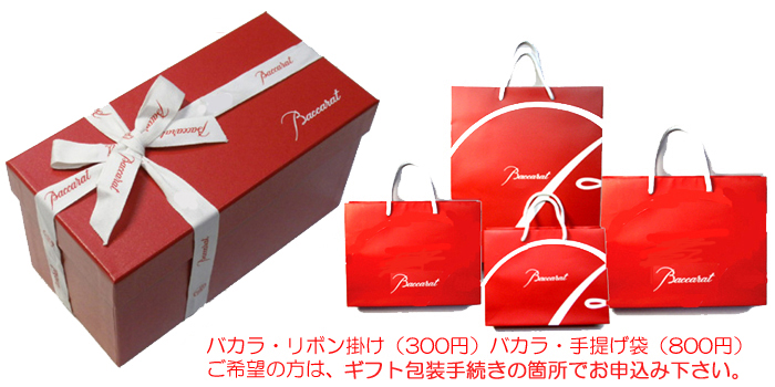 バカラのリボン掛け 300円  バカラ手提げ袋 800円 (お申込みフォームの通信欄に、ご希望内容を、ご記入ください)