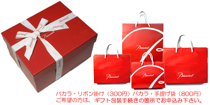 バカラのリボン掛け 300円  バカラ手提げ袋 800円 (お申込みフォームの通信欄に、ご希望内容を、ご記入ください)