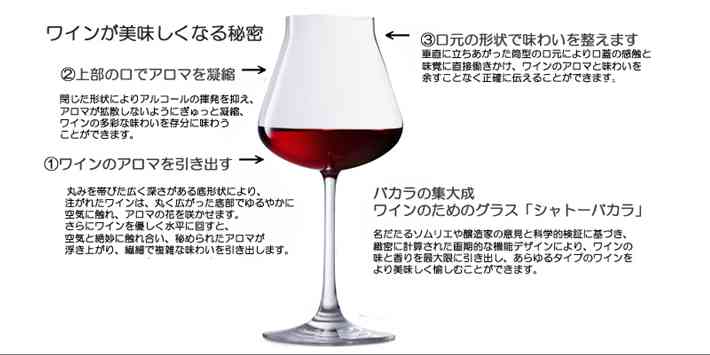 シャトーバカラ ワイングラスは、グラスのボディ形状が、その特徴でボウル内に深いアロマが立ち上がり、その気品と優雅な芳香な香りが、このグラスのなかで蘇ります。この重厚感のあるフォルムが優美な上品さをかもしだしています。