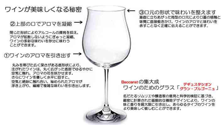 このグラン・ブルゴーニュグラスの形状は、ワインの酸味を引き出し、デリケートに立ち上る豊潤なワインのブーケとともに全体的な味わいを高めるので、アルコール度12.5%以上、活力のある酸味、過度なタンニンをもったコクのあるブルゴーニュタイプの赤ワインによく合います。このグラスの表面積に4分の1は、ワインのためそして、4分の3は、ブーケのための部分なのです。