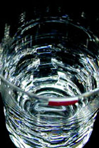 グラス側面の水玉模様がグラスの底に向って、光を集中させ、底部では、光が揺らめいて輝いている様子がよくわかりますね。