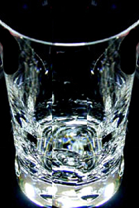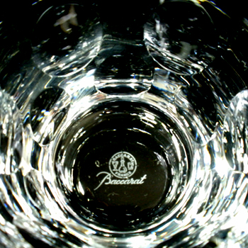 真上から底をみると、グラスの底にバカラのロゴマークとロゴ文字が見えます。側面には、エンボス加工の効果で引き込まれるようなクリスタルガラスの光の世界にいざなわれるようです。